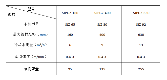 該機組由錐形(平行)雙螺桿擠出機、真空定型臺、牽引機、切割機、翻料架等組成。錐形(平行)雙螺桿擠出機及牽引機采用交流變頻調速或英國歐陸直流調速。真空泵及牽引電機均采用優質產品。根據管材的直徑及壁厚,牽引機采用上下履帶、三爪、四爪、六爪等牽引方式。切割機可選用鋸片式切割或行星式切割,另帶計長裝置。機組性能可靠、生產效率高。