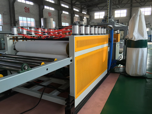 該機組采用專門設計的SJSZ錐形雙螺桿擠出機,采用進口ABB,西門子變頻器調速,選用進口RKC、歐姆龍溫控儀表,具有調節范圍廣,溫控精度高,操作方便可靠等優點,輔機由定型臺、牽引機、裁邊機,橫行切割機及推料架組成,模具配備模溫機冷卻裝置確保板材表面定型效果。對輥式牽引機(8對)采用進口減速器電機及變頻器,具有結構合理、牽引力大,牽引穩定等特點。切割機具有工作可靠準確,切割精度高的優點,推料架附有可移動的推料小車和特制的橡膠保護層,具有不傷料,使用簡便等優點,輔機機組采用可編程電腦控制系統,整機控制可靠穩定。
