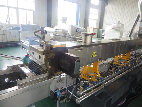 塑料冷切造粒生產線 該機組主要針對聚烯涇溶體指數高、粘度大,如PP、PS、ABS、PC料。螺桿經由獨特設計,適于各種原料的造粒、染色、再生,產量是一般機型的兩倍。滾刀式切粒機具有旋轉平穩、均勻、節能省電、操作安全等特點。