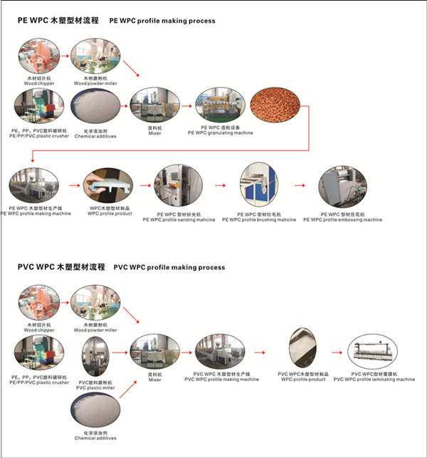 展示了木塑型材擠出生產的原料準備, 擠出, 產品后續處理過程,將生產過程中需要的設備全部列明