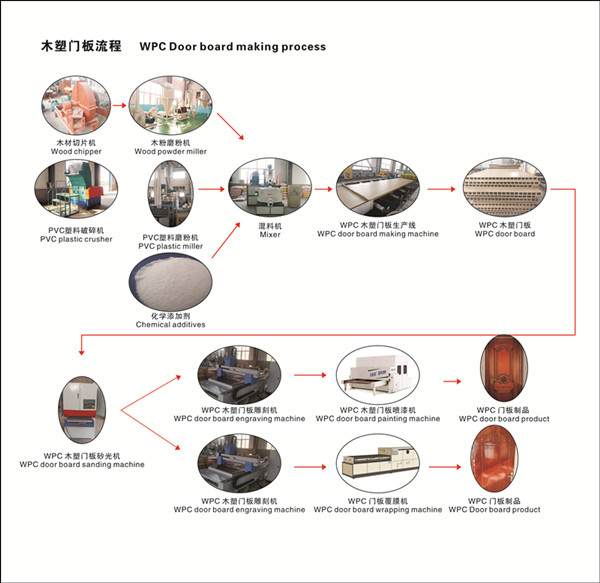 展示WPC 木塑發泡門板生產過程中從原料備料, 制品擠出, 制品處理的全部過程。